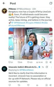The viral post suggested that users would soon be able to withdraw Pi Network coins through a Unocoin ATM. But Unocoin itself has publicly clarified that: